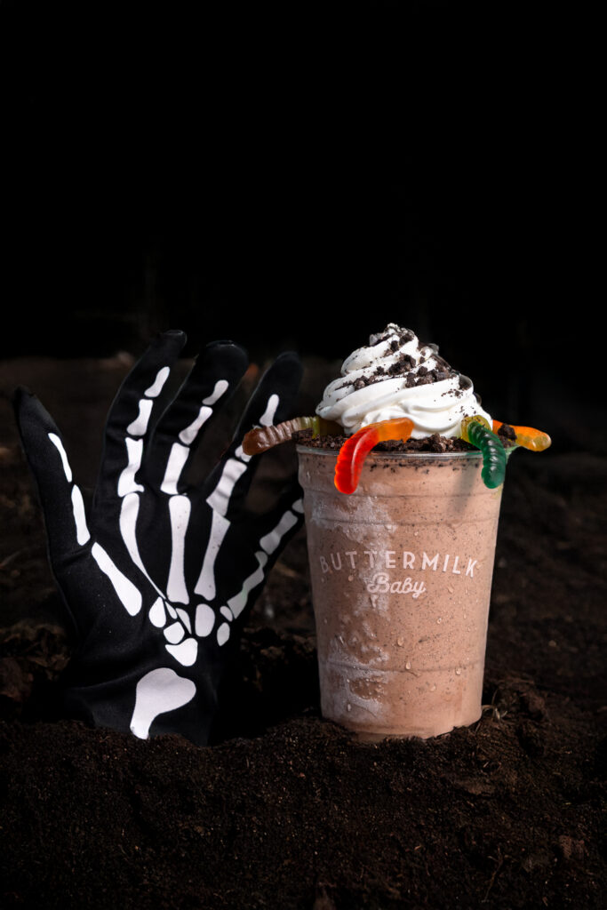 BUTTERMILK BABY: Just in time for Halloween and the cozy season ahead, guests can enjoy festive spins on the classics. these include the Graveyard Delight with Chocolate soft serve, Oreo® crumbs, gummy worms, whipped cream; Monster Mash Dasher with Vanilla soft serve, Reese’s® Peanut Butter Cups, Reese’s® Peanut Butter Sauce, whipped cream, chocolate sauce, sprinkles; and Pumpkin Spice Frappe with Pumpkin pie syrup, cold brew, whipped cream, pumpkin pie spice. Photo courtesy of Buttermilk Baby.