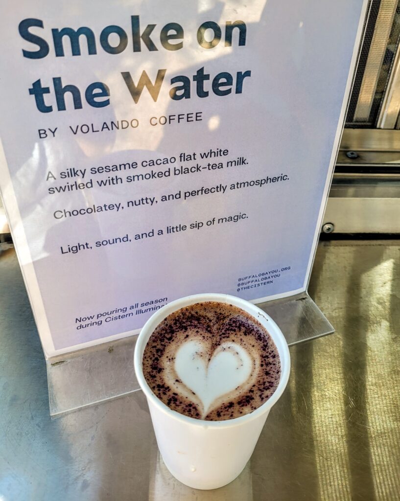 Enjoy the festive “Smoke on the Water” beverage provided by Volando Coffee while there. This special drink will be available for the duration of Cistern Illuminated.