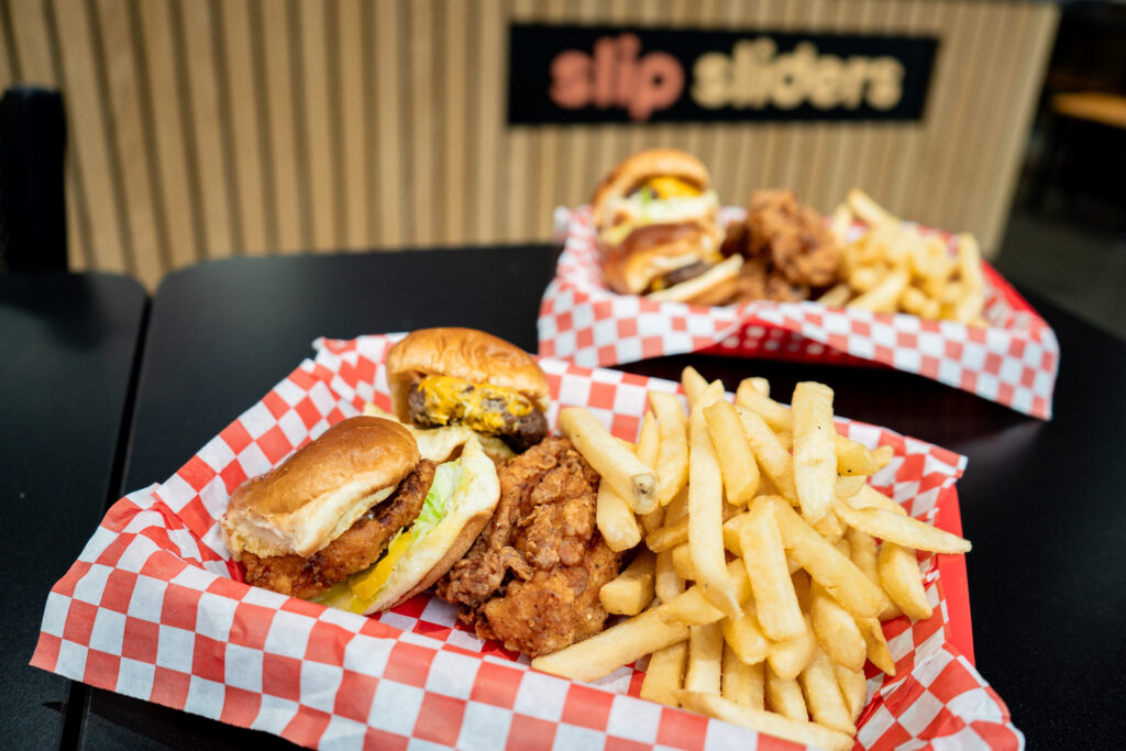 Slip Sliders, conveniently located near the Metrorail Red Line, is offering Highlighted Menu Items including Beignet Bites, Hickory Dickory beef slider, Backyard Burger beef slider, Southern Comfort fried chicken slider, and Hand-battered chicken tenders. Photo courtesy of Slip Sliders.